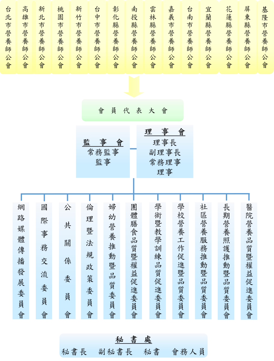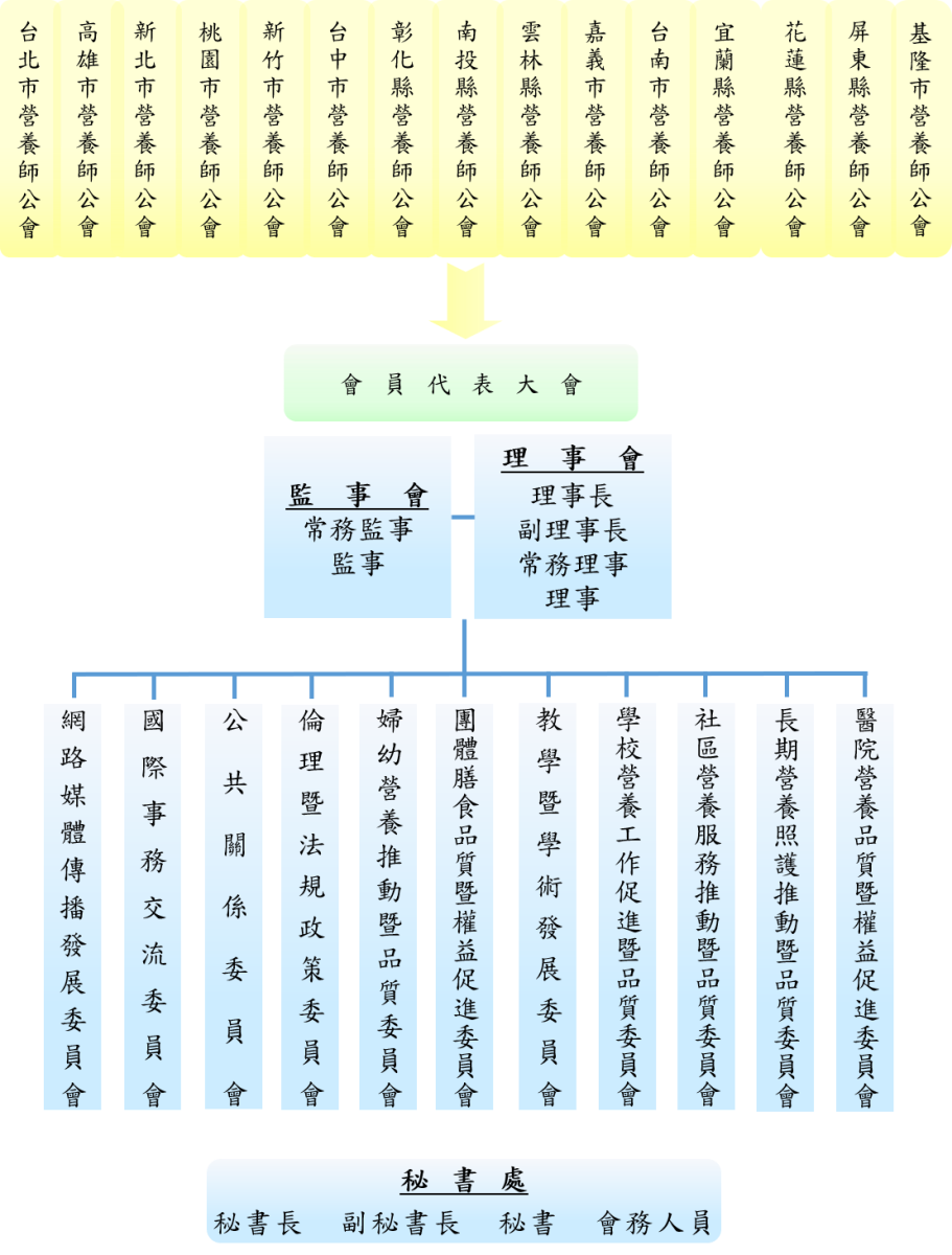 全聯會設有監事會、理事會、各領域委員會及秘書處。